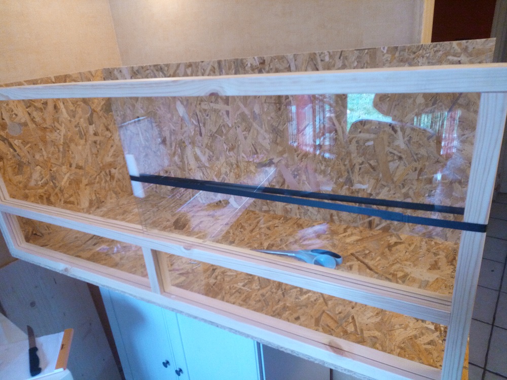 Ce que je vais rajouter pour fignoler ce beau terrarium : des baguettes en bois pour les angles, une tringle afin de mettre un rideau devant la vitre (pour protéger du soleil ou pour cacher si je recois des personnes ayant peur des reptiles).
